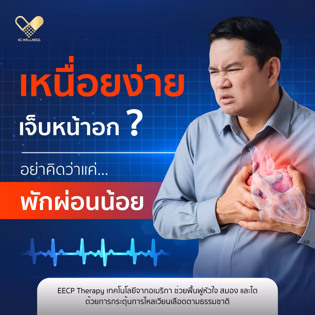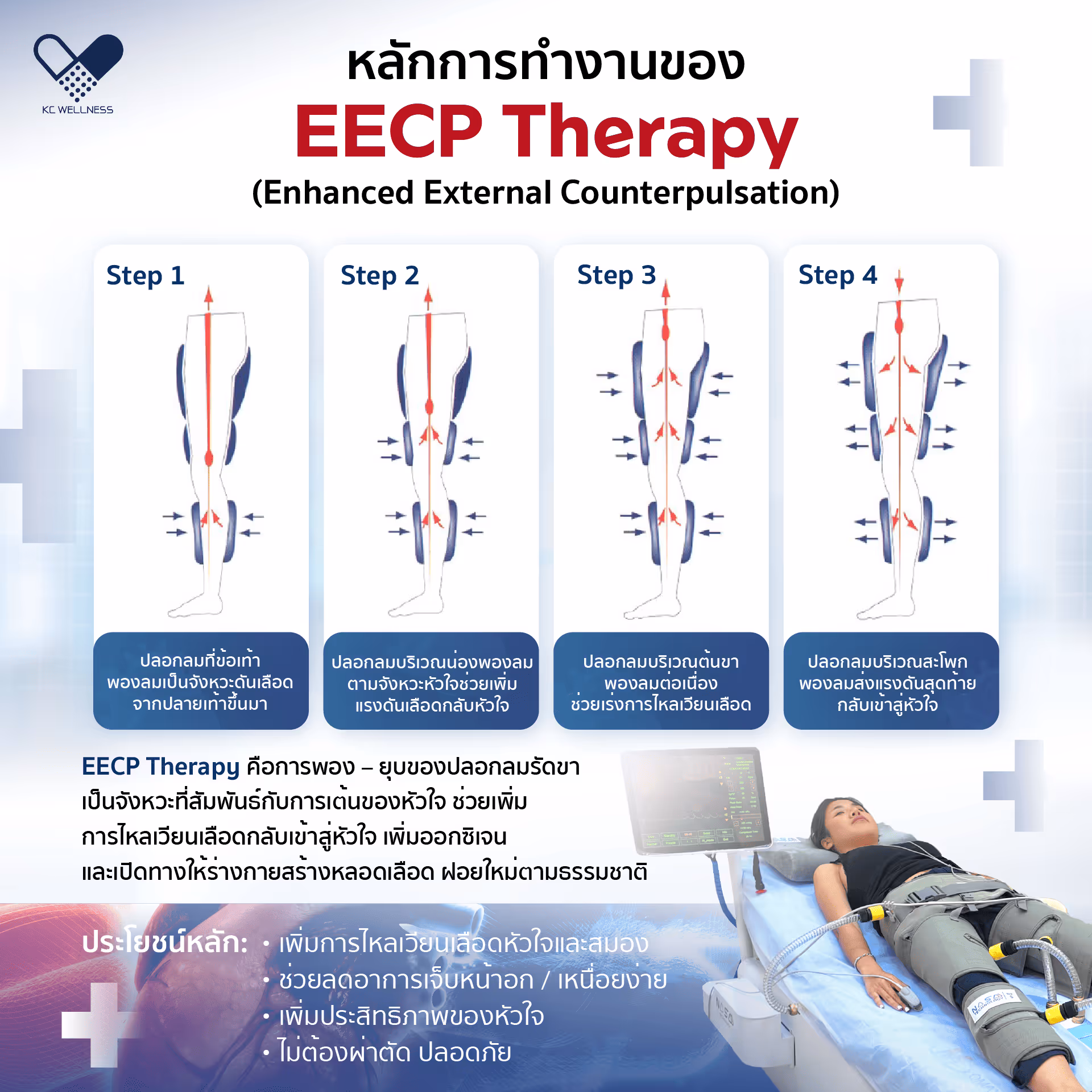 “ หลายคนกลัวว่าการรักษาเกี่ยวกับหัวใจจะยุ่งยากหรืออันตราย แต่ EECP ไม่ต้องผ่าตัด ไม่ต้องพักฟื้น และปลอดภัยภายใต้การดูแลของแพทย์หัวใจผู้เชี่ยวชาญ — คุณสามารถกลับไปใช้ชีวิตได้ตามปกติหลังทำทันที